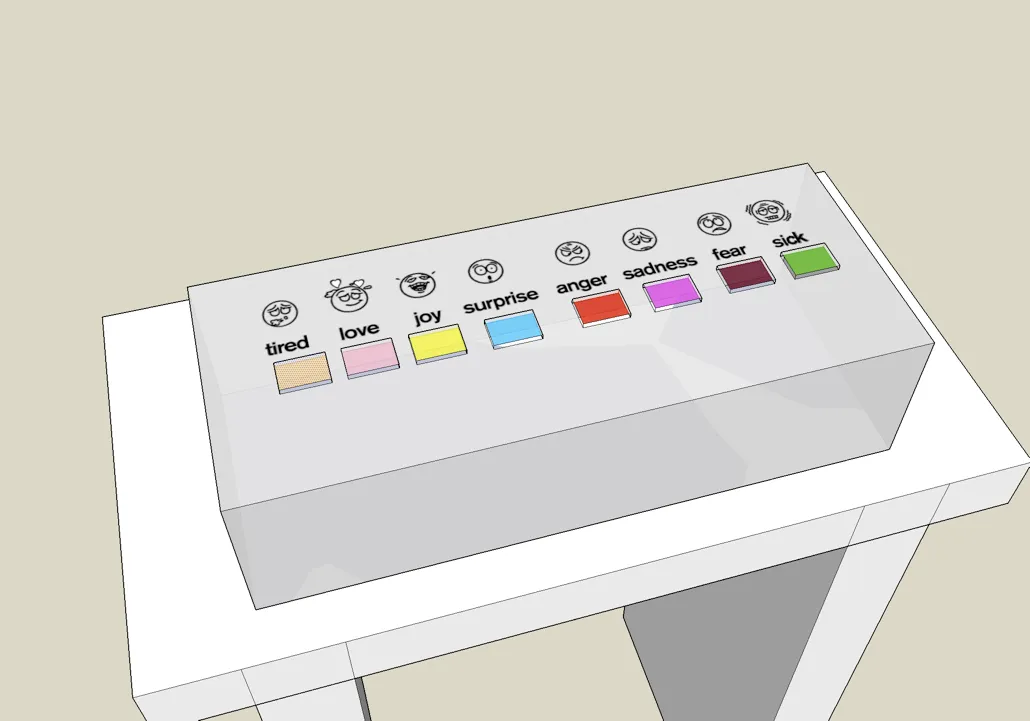 An early monday morning at ITP. You are still sleepy, you said hi to Gloria, and as walking through the hallway you passed through the box on your right which is illuminated in pink. You smile, because now you know that someone on the floor is in love. You want to participate so you go ahead and press the button with yellow color and labelled tiredon the box. Now the color of the box turns into yellow.