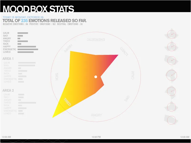 The idea is I am going to be displaying landscapes of moods through this visualization with different timescales. It is still raw but I am thinking to add a scaler bottom of the screen which we can adjust to scale through time which will give us diffferent results instantly. Also when a user wants to see different moods according to different locations (for now it is only 2) he can overlay with his/her mouse to those titles and can see outline of local mood landscapes overlayed on the actual display. The properies of the visualization can be extended pretty easily. Once I start to work on the flash piece probably I am going to be enriching this piece.